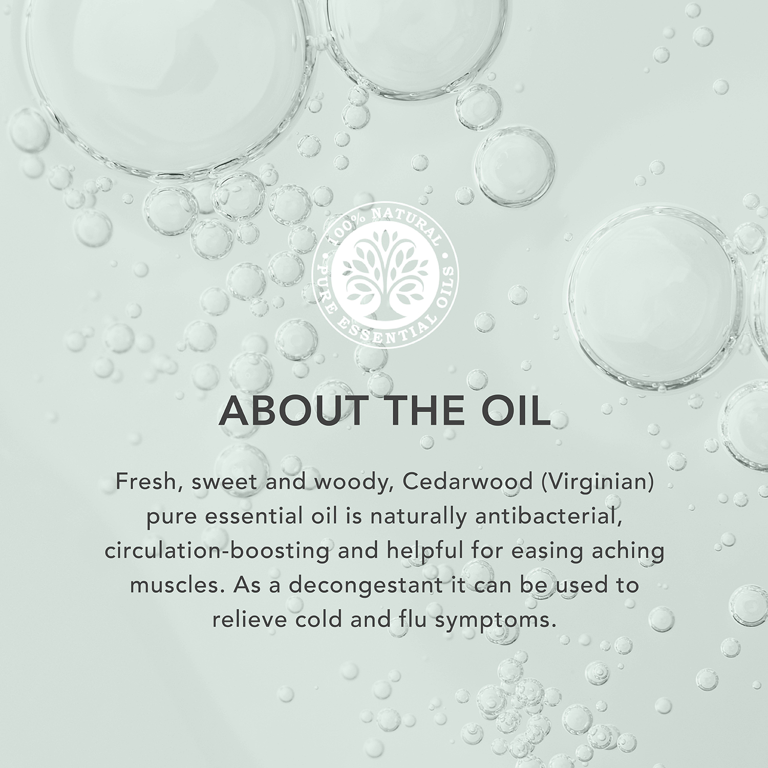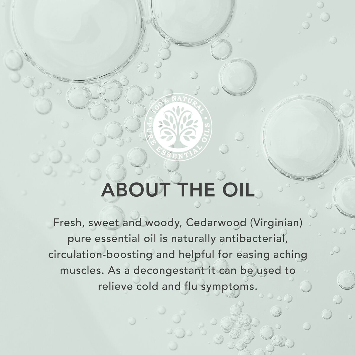Usado em misturas de massagem para aumentar a circulação, aliviar os músculos doloridos e ajudar a eliminar as toxinas do corpo. Fresco e doce Cedarwood Virginian é extraído de uma árvore da família cupressácea. A casca da árvore cultivada nos EUA e Canadá é destilada a vapor, para liberar um óleo essencial fresco e lenhoso.